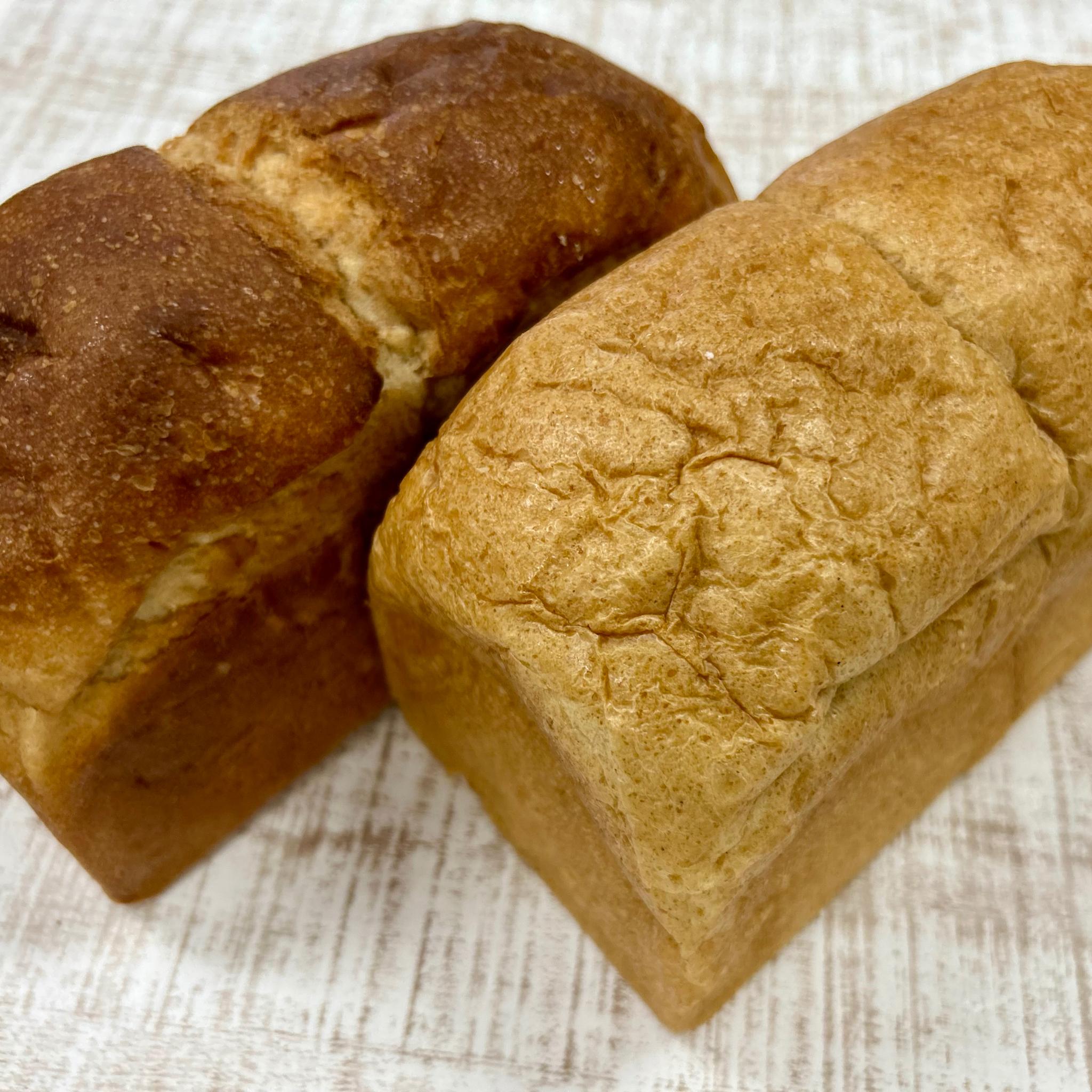 初めての方でも食べやすいスペルト小麦20%の山食パンのやさしい風味と、スペルト100%ふた山の濃い旨み、2つのパンを食べ比べ